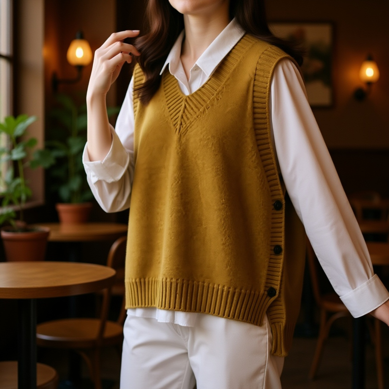 ● ゆったりとしたVネックデザインで、首元をすっきり見せつつ、体型もしっかりカバーできるニットベストです。