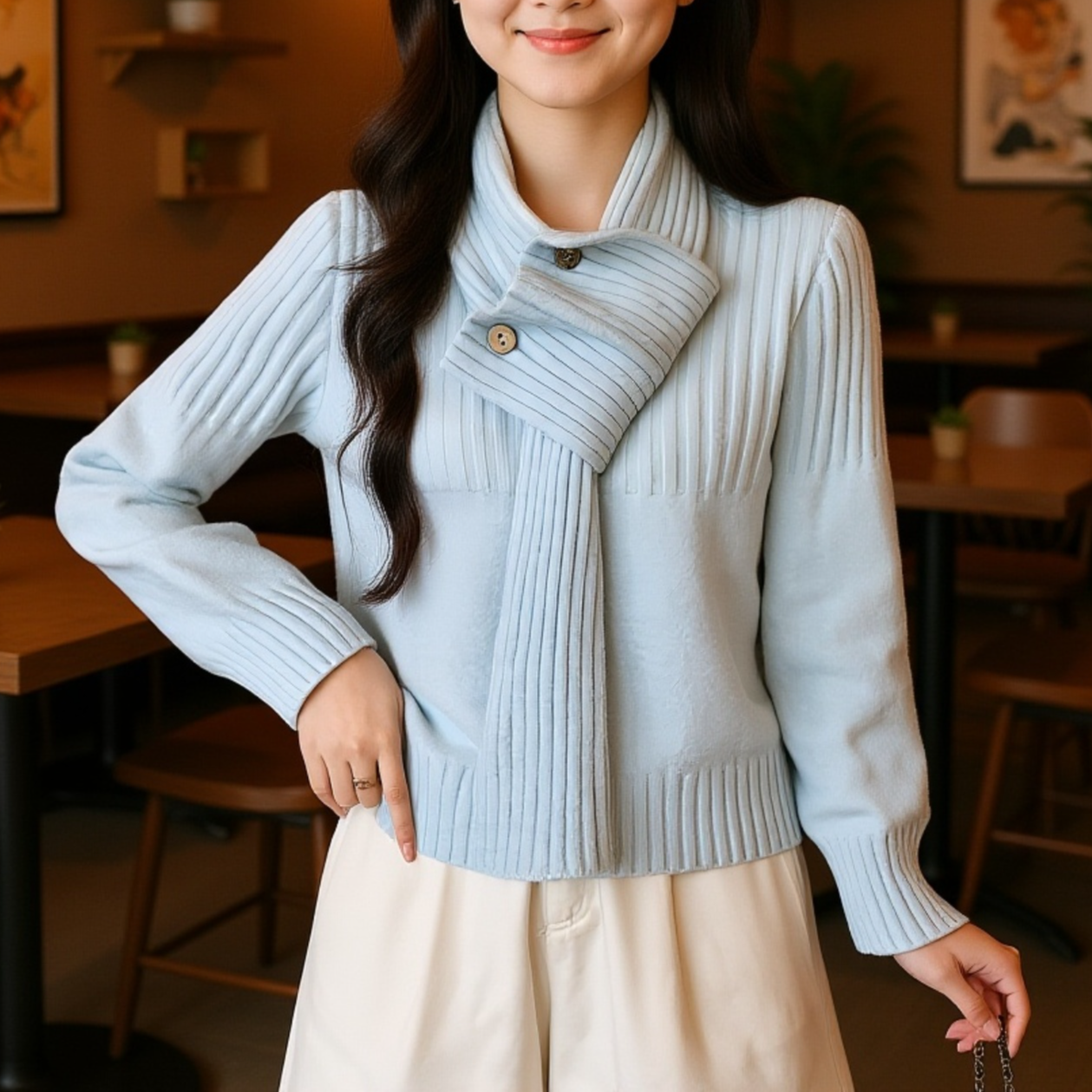 ● 韓国風デザインが魅力的で、洗練されたエレガントな雰囲気を演出する無地のツーピースセーターセットです。